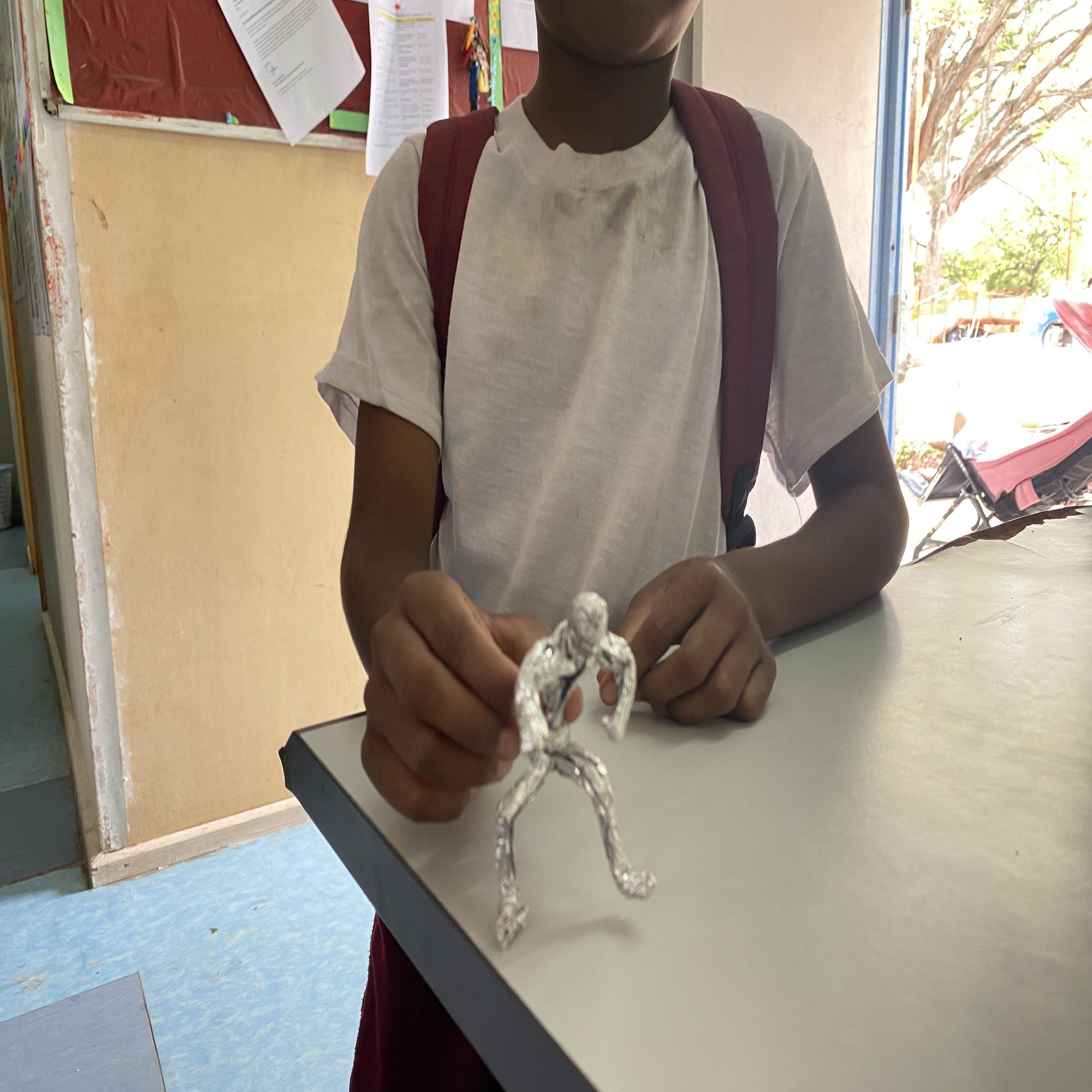 お昼までだったのでちょうど授業は終わり、ランチを食べ終えて帰る子どもたち。賢そうな男の子が、今日の授業で作ったというアルミホイルの人形を誇らしげに見せてくれた。