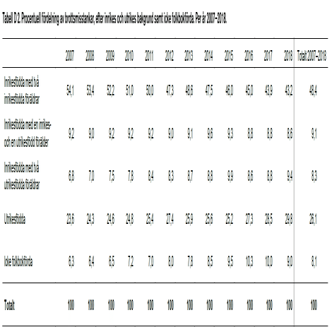 同報告書の「Tabellbilaga 3: Delstudie 3」(付録表3:分科研究3)の表「Tabell D 2」には、犯罪容疑者の出自別割合が2007年から2018年まで年次で掲載されている。
