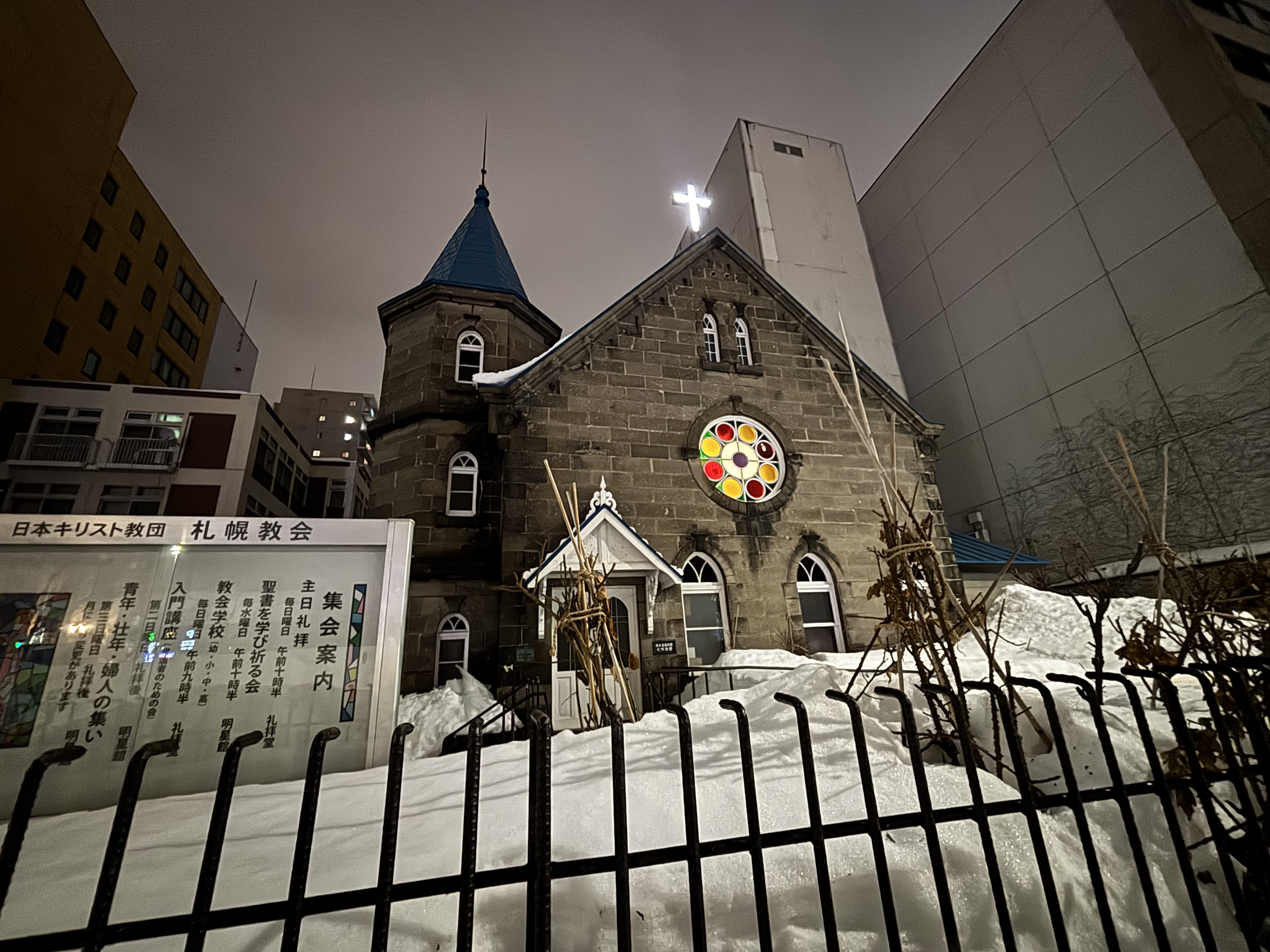 川の東側にあった札幌教会。雪積もる夜の西洋建築はムードがありますね