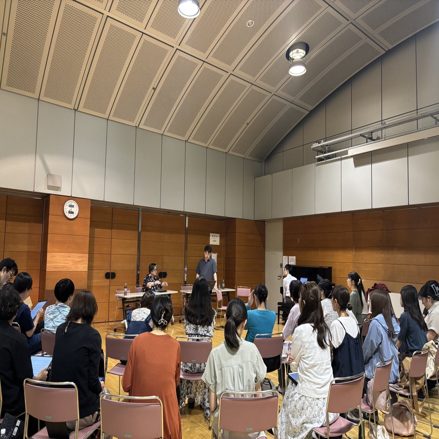 リハーサル会場の駅前で、紫衣さんと合流させていただき、お礼を申し上げながら色々と詩についてのお話を伺い、会場に向かいます。この日の練習場所は東京コンサーツラボ。「そういえば昔、現代音楽をここで何回も聴いたなぁ……」と懐かしい気持ちになりながら、会場に着くと、すでにピアニストの渡辺研一郎先生と合唱の皆さんの濃厚なセッションが展開されていました。