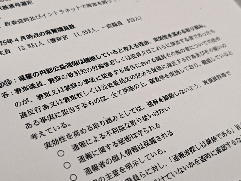 「法令違反行為、警察もしくは公安委員会の定める規定に違反する行為、その疑いのある事実に該当するものは全て受理し、調査している。公益通報者保護法の趣旨にのっとり、やるべきことをやっている」