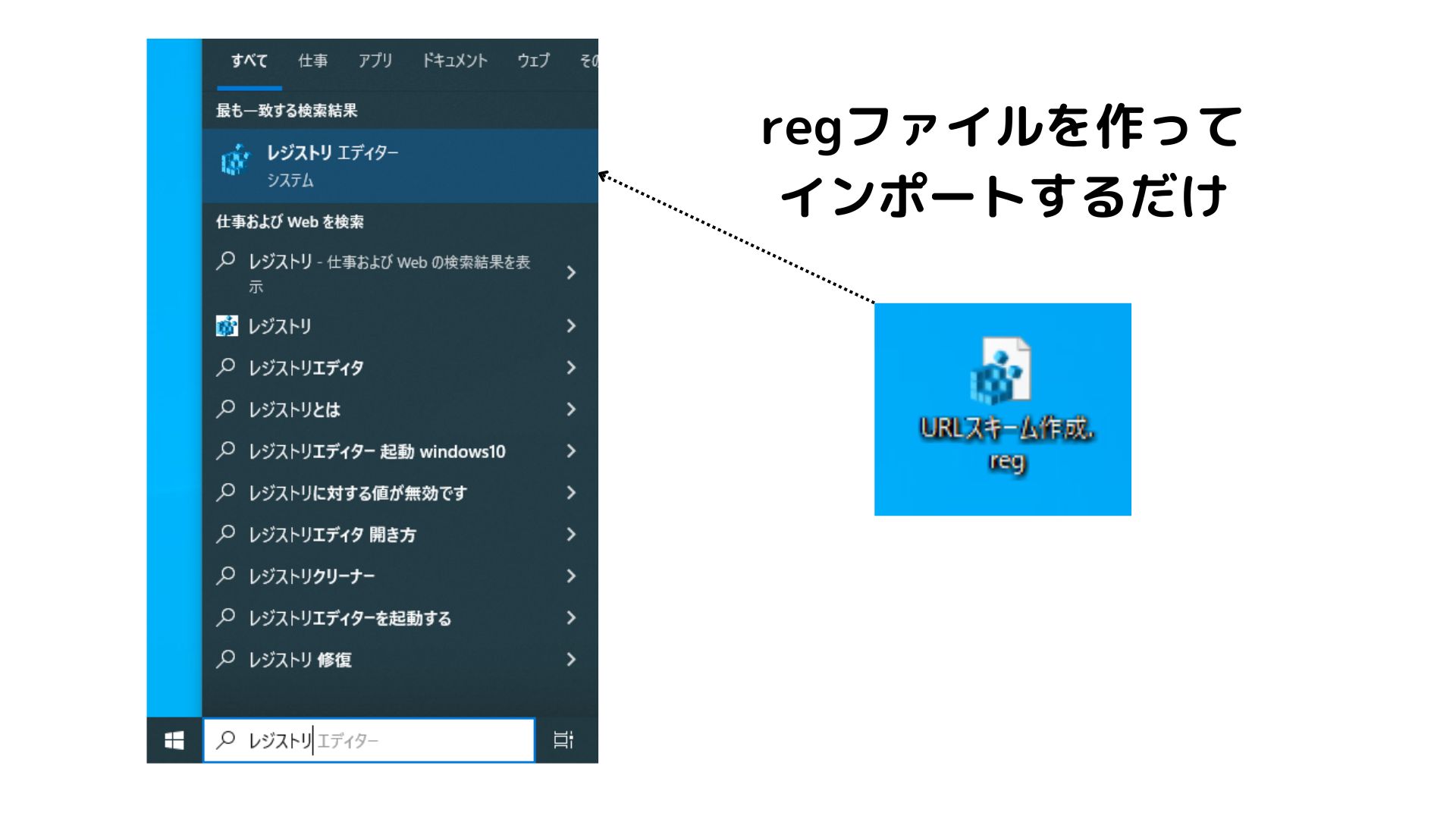 URLを入力してローカルのアプリケーション(exeファイル)を実行するにはレジストリエディターを使用します。その際にregファイルをあらかじめ作成をしてインポートするというシンプルな流れとなっております。