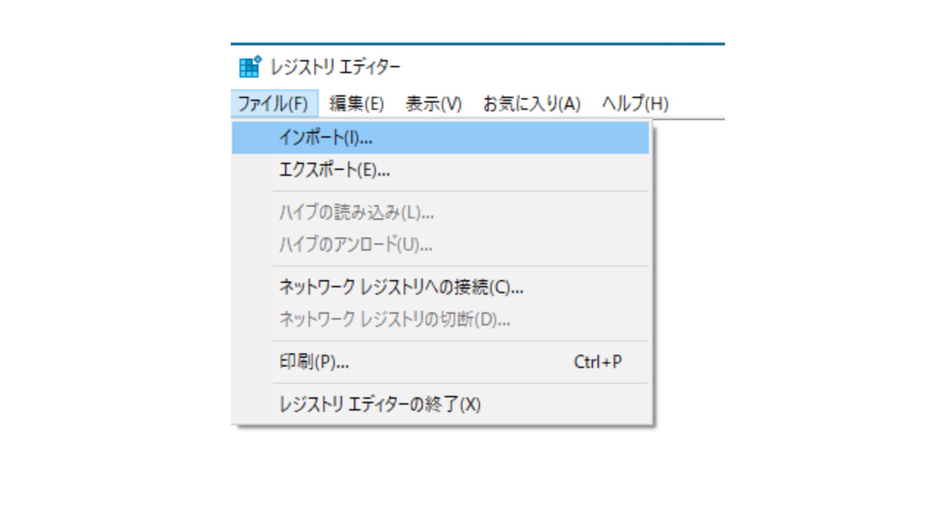 次にWindowsのスタートメニューからレジストリエディターを開いて「ファイル」を選択し、「インポート」をクリックします。