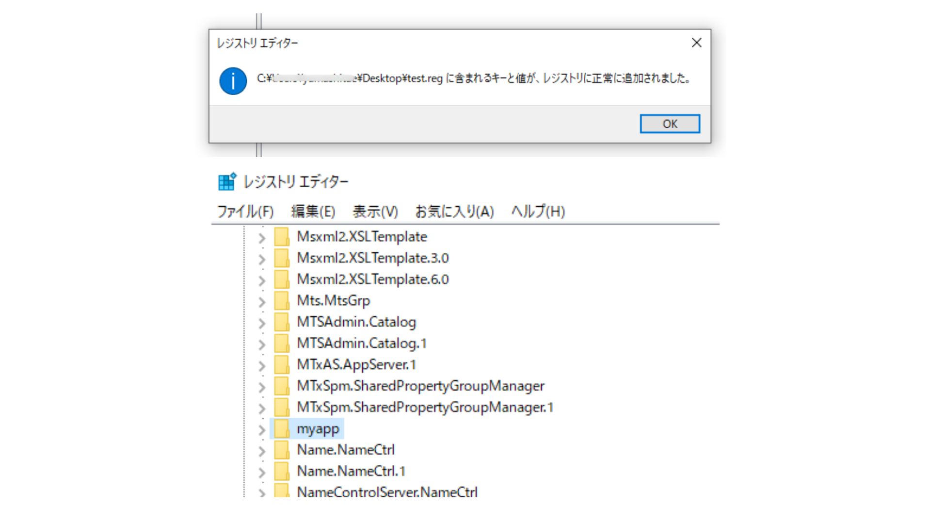 その後、作成したregファイルを指定すると「レジストリに正常に追加されました」というコメントが出れば完了です。