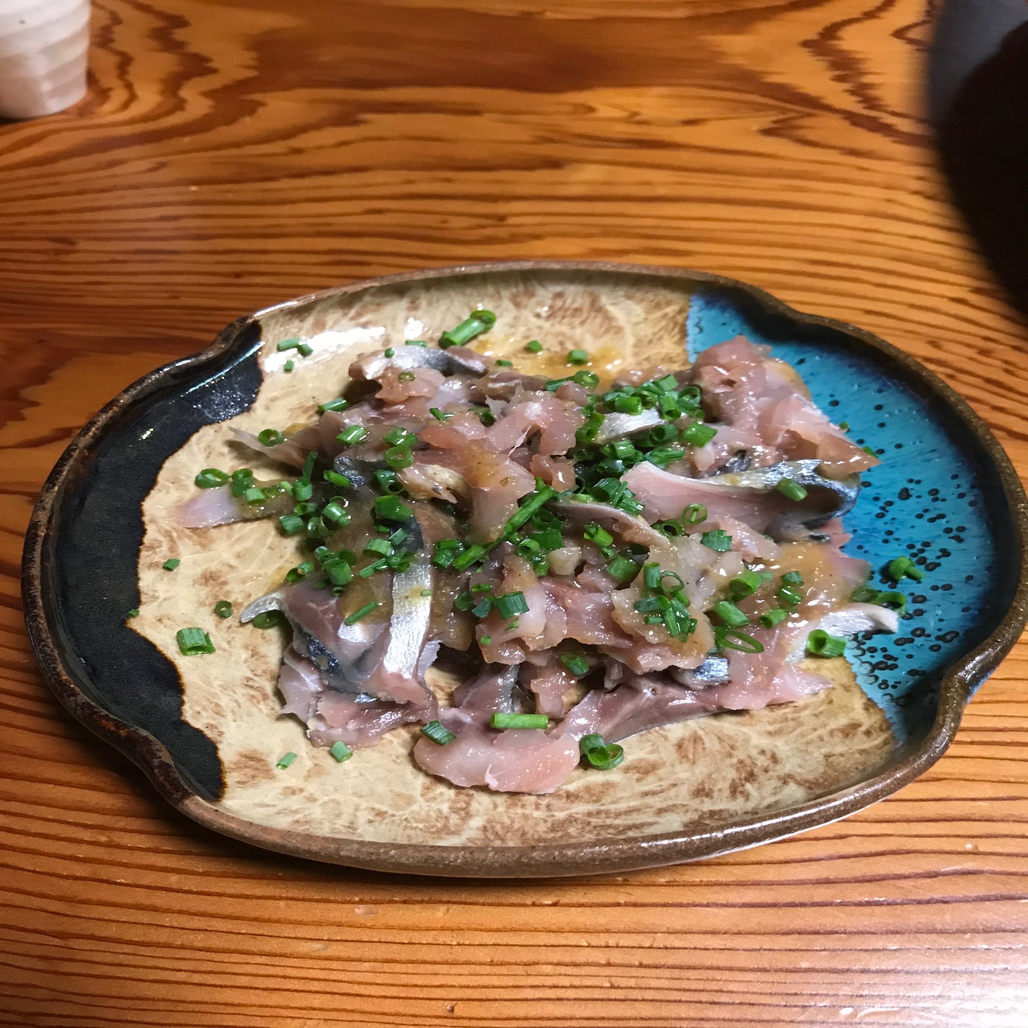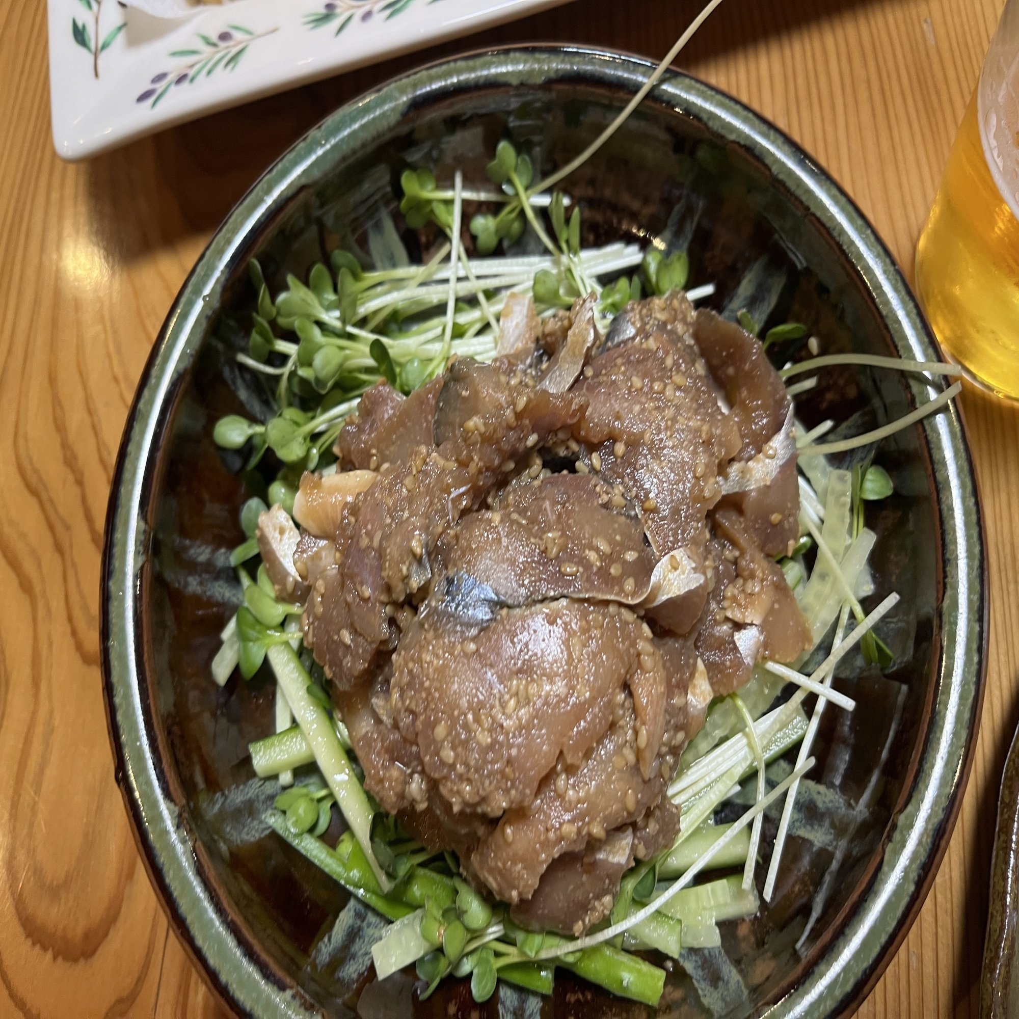 「サバの刺身に醤油ベースのゴマだれを和えたもの」