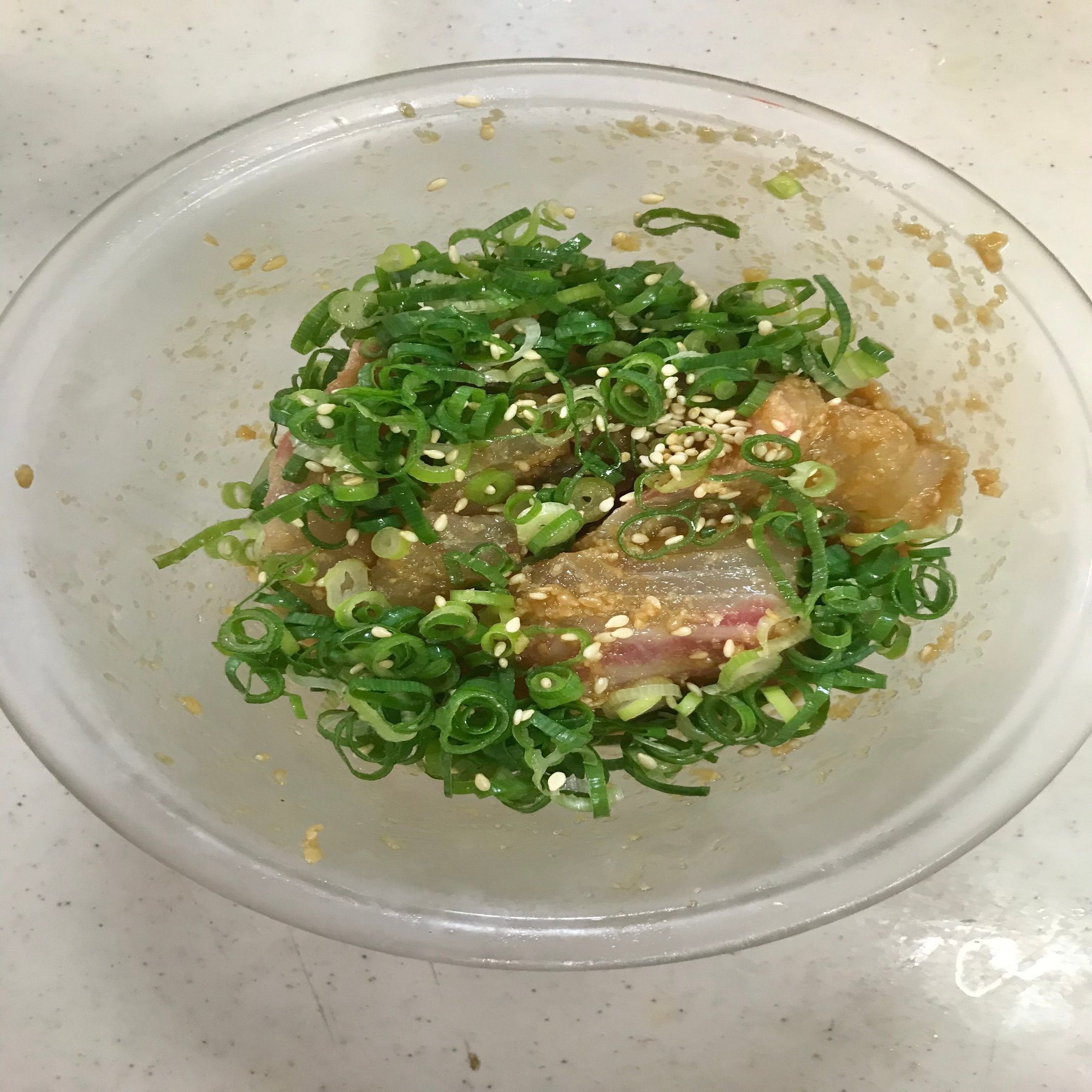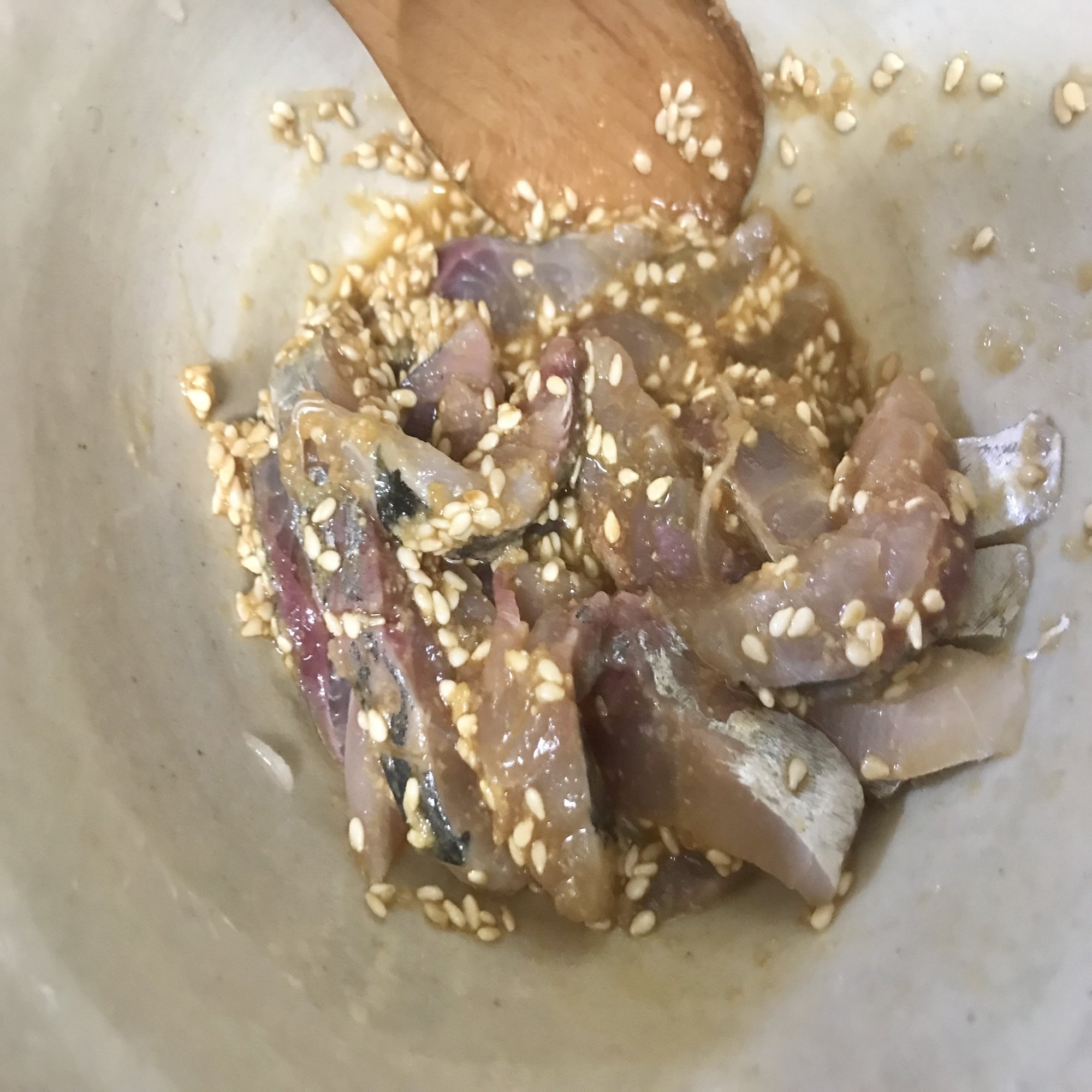 これを早速上述のタレであえたら「ゴマサバ風アジ」の完成!タレさえ作ってしまえばあとは刺身を切って混ぜるだけなので案外はやくつくれますね。