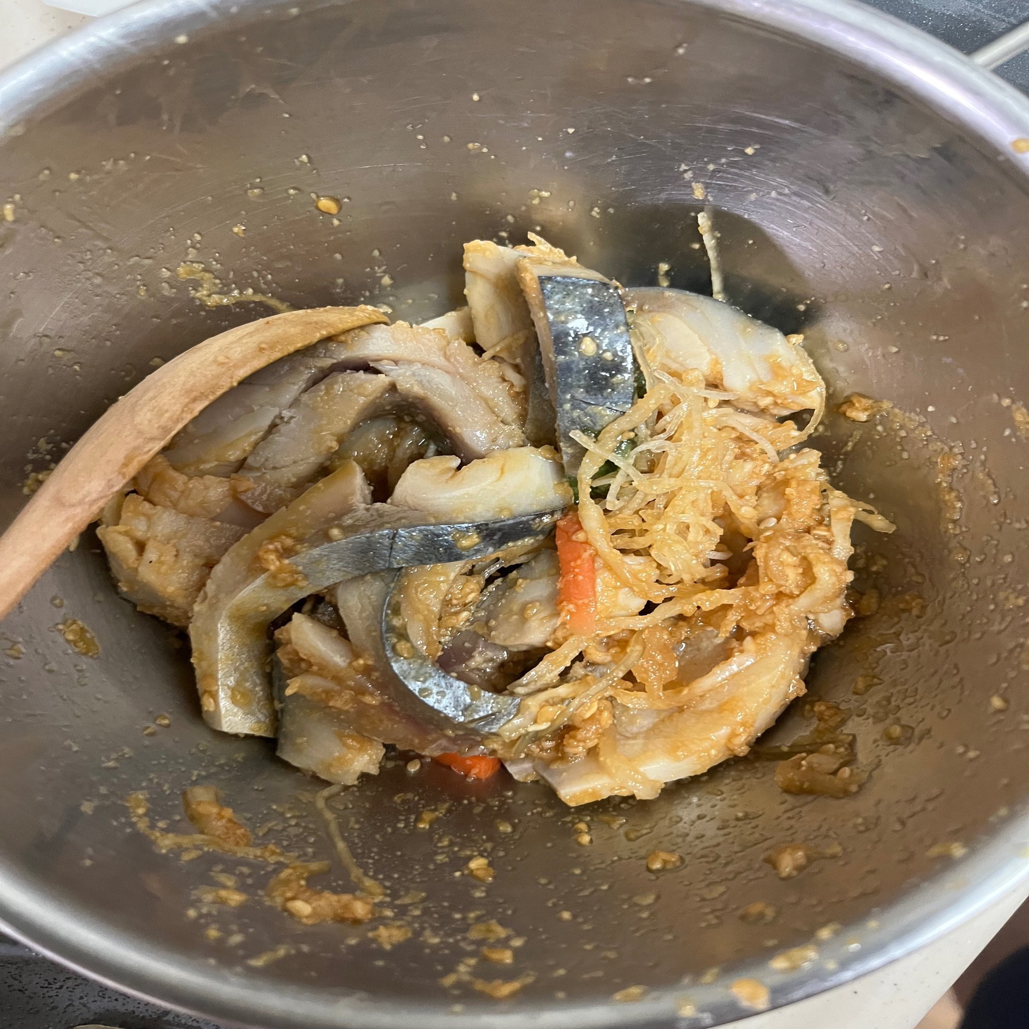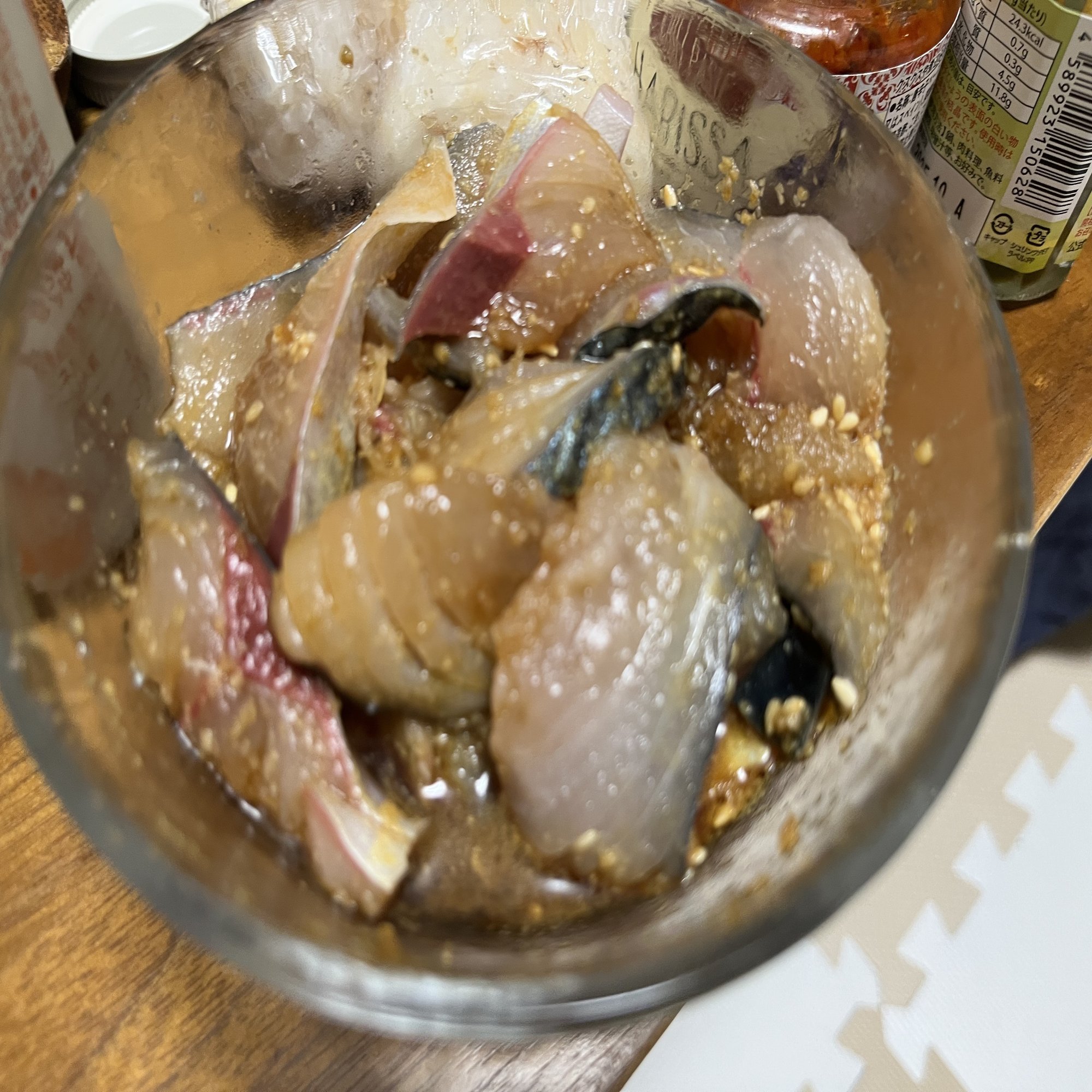 しめさばがしめさばであるためにはかなりの酢で締める必要があるのですが、それによってごまダレの塩気とかなりぶつかる感じになってしまいました。しょっぱいしすっぱい。かと言ってしめさばの身を水などにひたして酢を抜こうとするとボロボロになってしまって食感がどうしようもない。