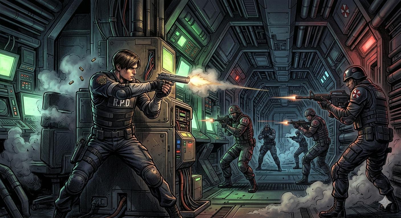 {Resident Evil: Leon S. Kennedy in a gun fight against Umbrella Corp’s armed agents in a dark futuristic tunnel} color-illustrated in Mark Schultz’s (b. 1955) signature comic pictorial style, which is a neo-classical synthesis of virtuosic Golden Age pen-and-ink draftsmanship and Burne Hogarth’s dynamic figure dynamics, utilized to capture epic cinematic depth that fuses rigorous scientific realism with visceral underground comix energy: {