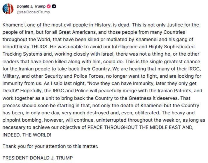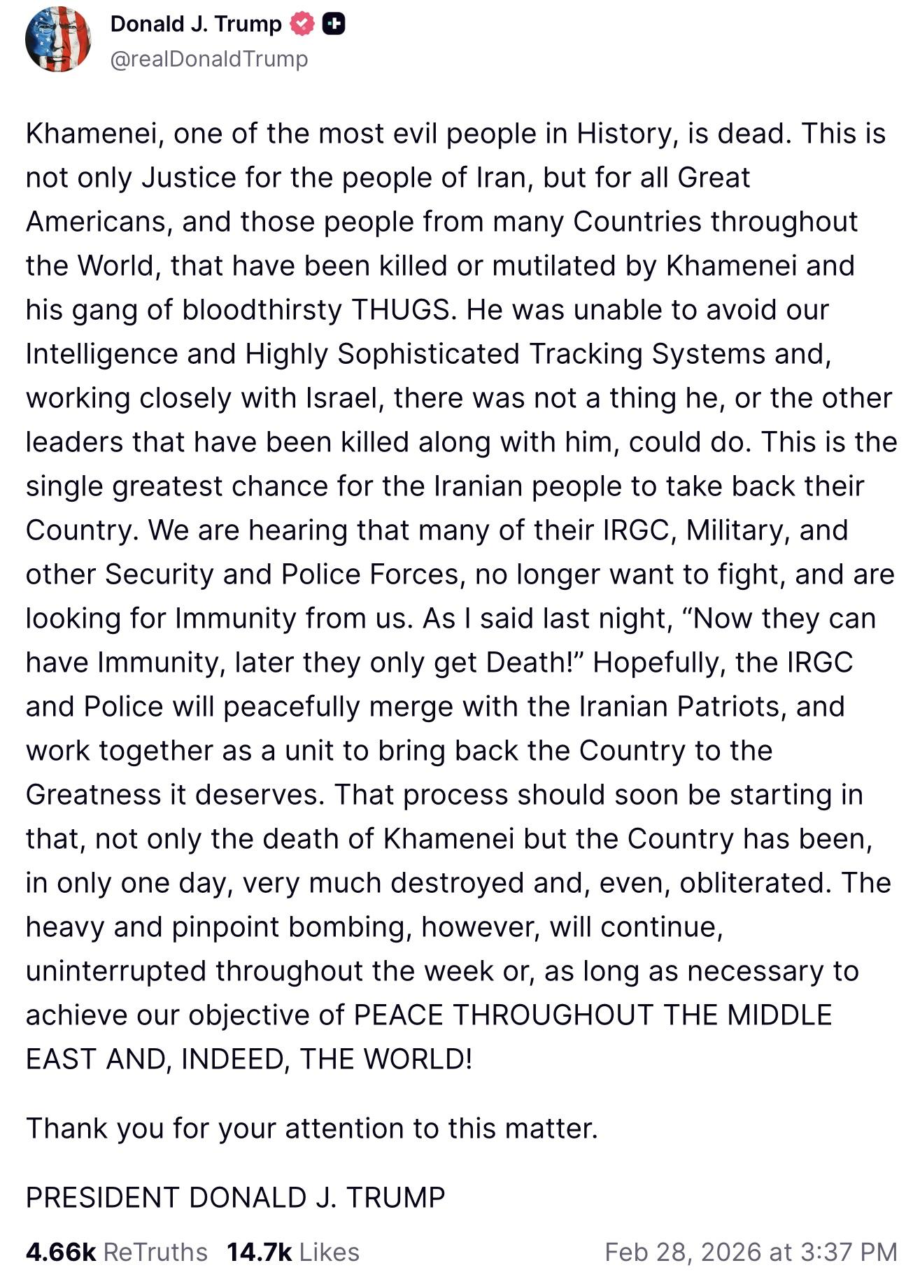 >US president Donald Trump describe am as ongoing "major combat operations" and e ask Iranian govment forces to lay down dia arms.