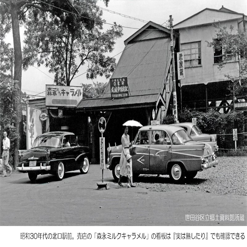 同じ北口駅前(小さな売店があった)の風景は、成城住まいの青柳信雄監督作『花嫁会議』(56)や『新婚七つの楽しみ』(58)、『実は熟したり』(59)などの大映映画で、主演の若尾文子や川崎敬三と共に画面に写り込んでいます。