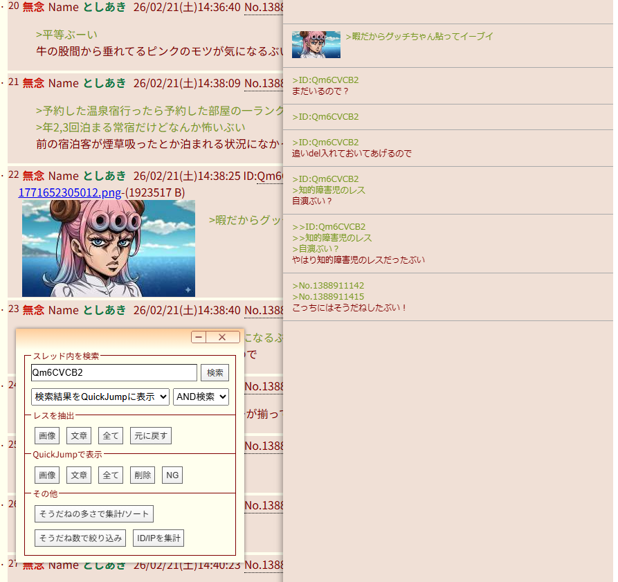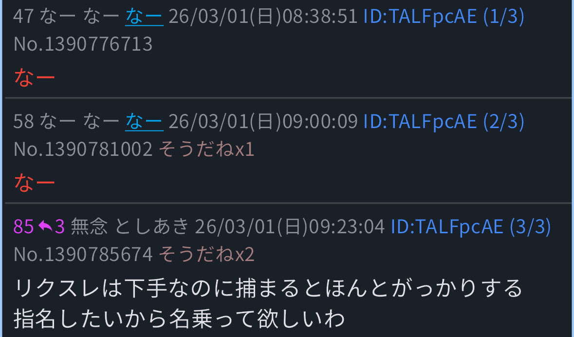| … | PLAY 653 無念 Name としあき 26/03/01(日)19:05:49 No.1390917932 delそうだねx1>リクスレでもIDつけろうるさいやつらいるけど同じ勢力なので? |