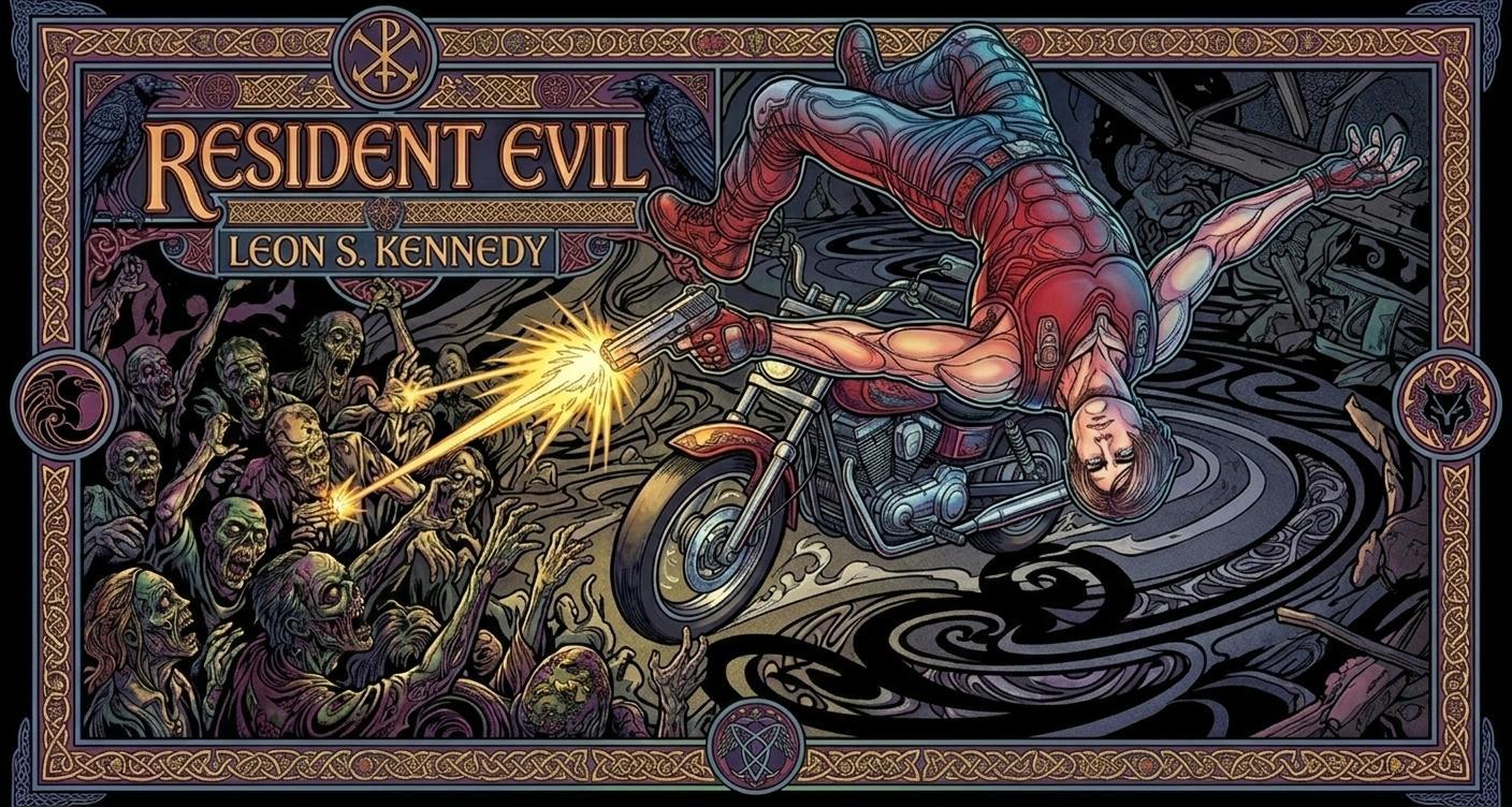{Resident Evil: Leon S. Kennedy executes a mid-air body-flip off his bike, emptying his gun into the horde of zombies before the wheels even touch the asphalt} color-illustrated in Jim Fitzpatrick's Western comic-infused Celtic-Nouveau visual style: {
