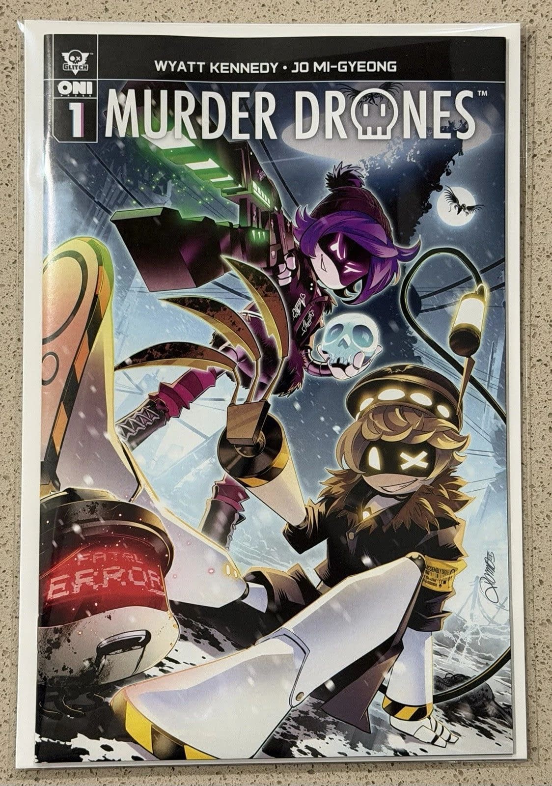ROBOTS! REBELLION! AND THIS SICK-AS-HELL RAILGUN! From Glitch Productions and Oni Press, the record-shattering adaptation of the groundbreaking animated series from writer Wyatt Kennedy (Nights, Wiccan: Witches' Road) and Jo Mi-Gyeong (Eve) continues! Following the annihilation of the human colonists once tasked with gutting its resources in order to maximize shareholder value, the remote exoplanet of Copper 9 stands in ruin. But, beneath the surface, the colonists' robotic worker drones have built a new kind of life for themselves with purpose, schools, doors, and card games! Now, teenage drone Uzi has made an unlikely bestie in Disassembly Drone N, whose primary purpose, until very recently, was to destroy the worker drones (for reasons). But it's not just prom dates and awkward silences for these two wacky kids. A mysterious force continues to stalk the drone population from within, leaving a bloody trail of bodies in its wake. It's a real drag!