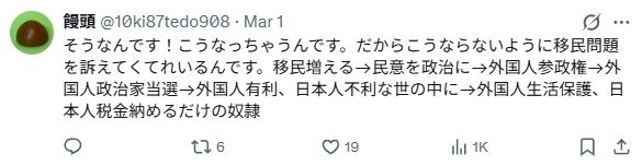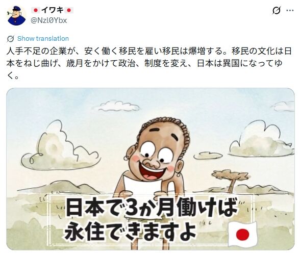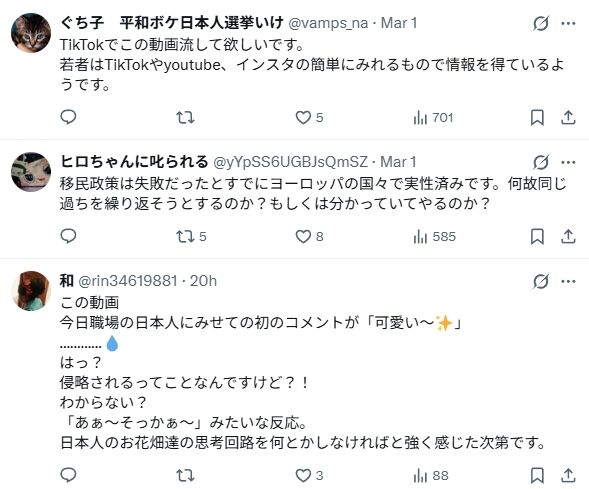何から何までデマと差別のみで作られたゴミ動画。こうした言説が広がることは社会にとって有害です。その害虫どもを調子づかせるのが日本保守党という団体です。日本保守党の掲げる「移民はいらん」というスローガンも、単純化された排除のメッセージにしかなり得ません。