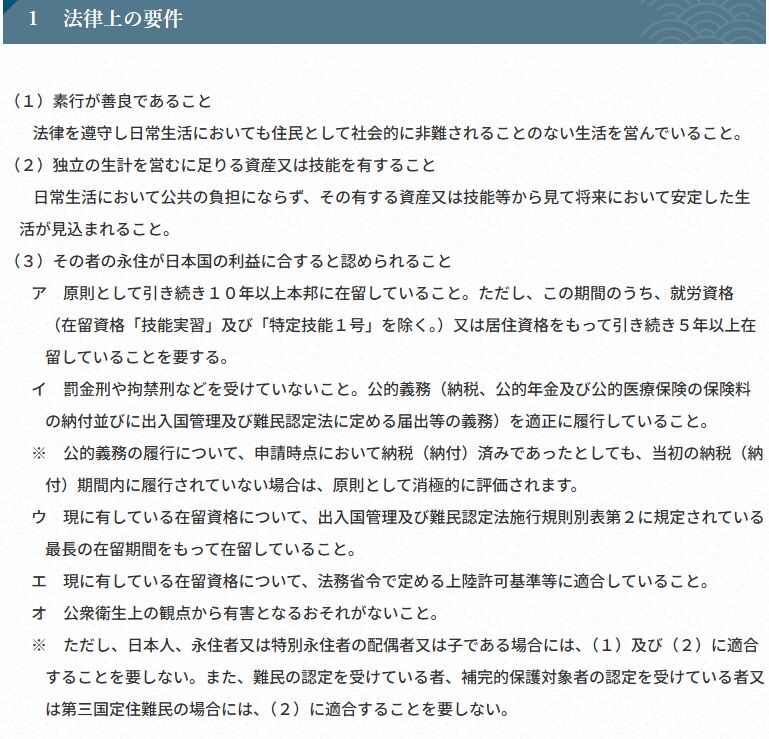日本で永住資格を得る要件は以下のようになっています。