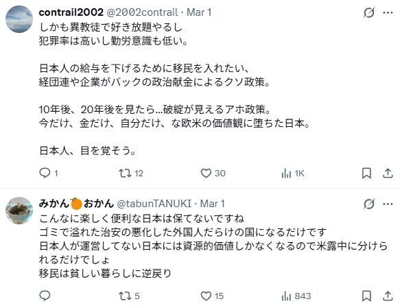 中には「侵略される」とか言ってる害虫まで。どうして真面目に日本に働きに来てる人たちを侵略者扱いできるんだ? マジで人間と呼ぶに全く値しない害虫です。日本に不要なのは外国人労働者ではなく、このように脳みそを停止して差別デマを拡散して外国人を侵略者扱いする害虫どもです。