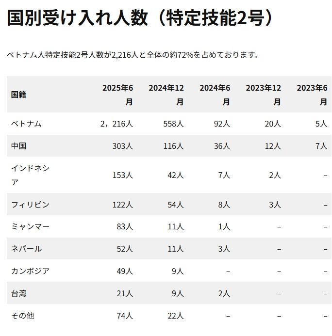 さらに、特定技能2号は昨年6月時点で3073人しかいません。また、そのほとんどはベトナム人です。動画のイメージとまるで異なりますね。それに希望すればだれでも取れるような資格ではありません。何から何まで嘘しか言わないのが日本保守党支持者です。