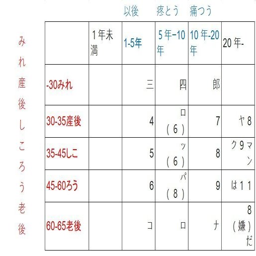 (「見れ産後 しころう 老後 以後 疼痛」は創作したオリジナルの語呂です)
