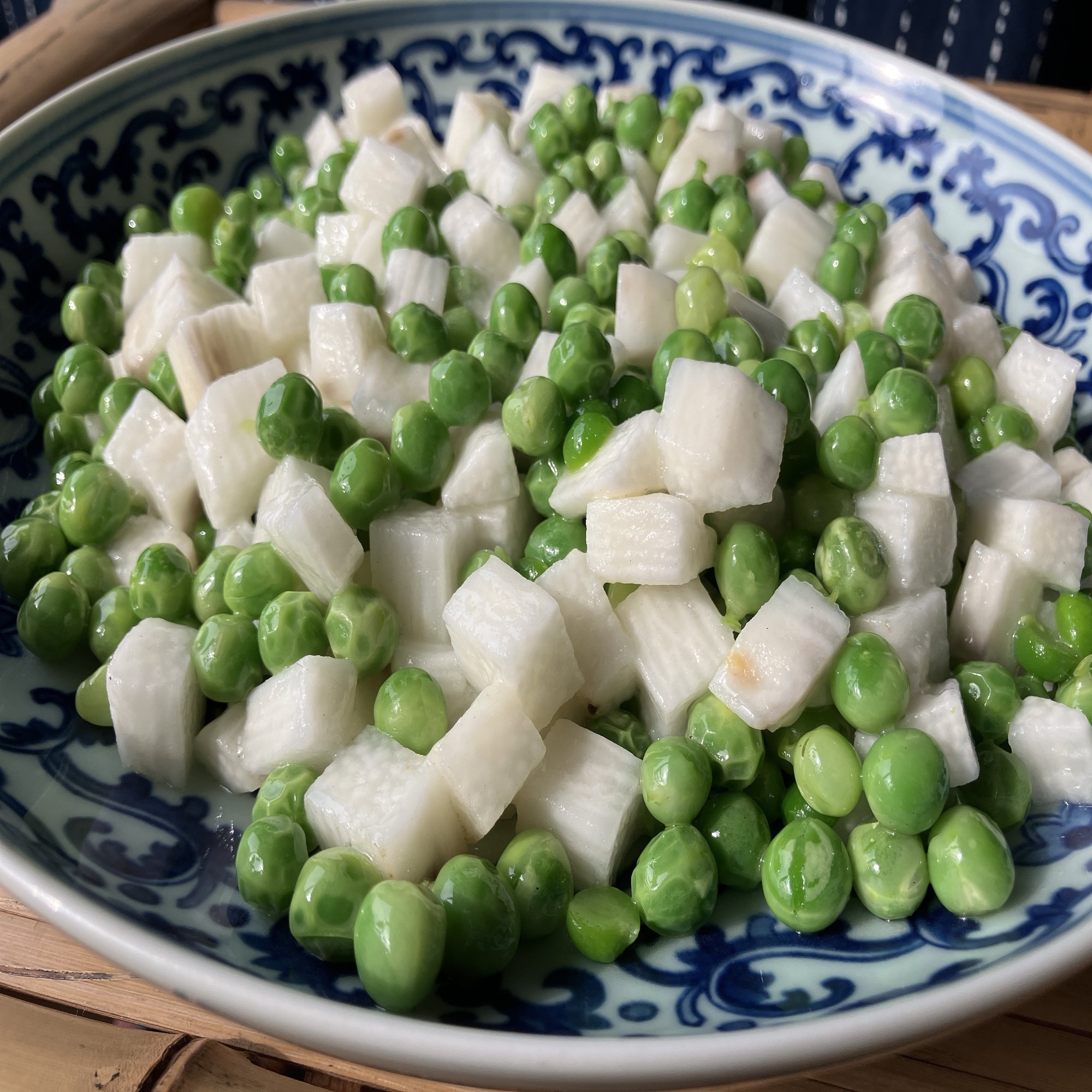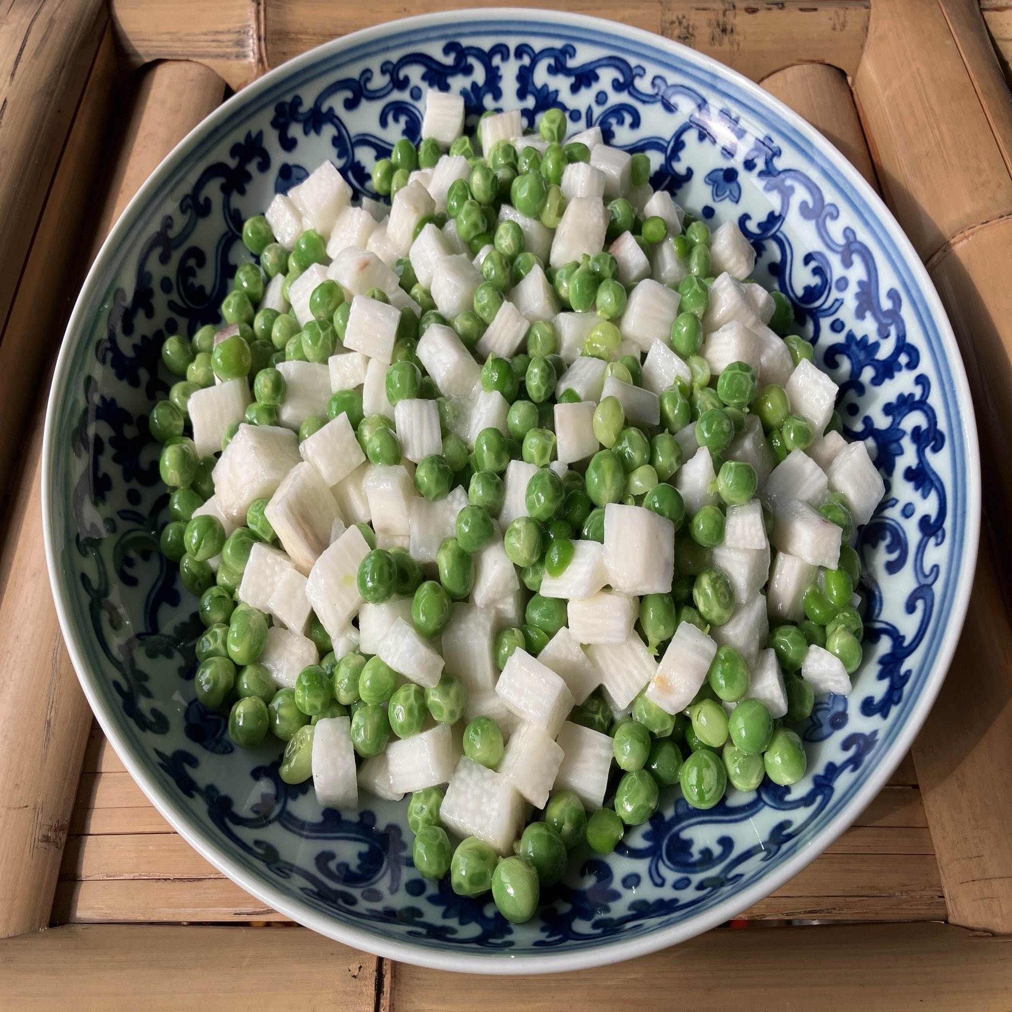 生のまま鞘から出したえんどう豆と賽の目切りにした長芋を炒め合わせるだけだが、豆の緑と長芋の白の鮮やかな色合いの対比には、この季節にぴったりの華やかさがある。