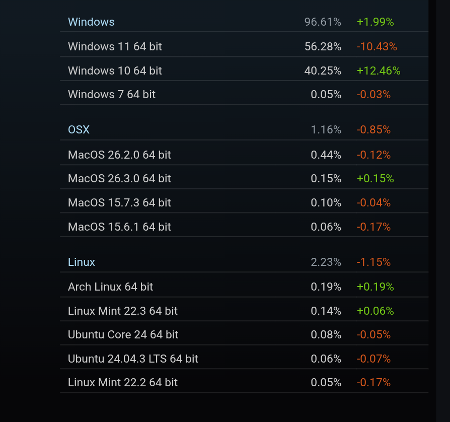 Linux took a MASSIVE HIT in last Steam survey, literally lost 33% of market share.
