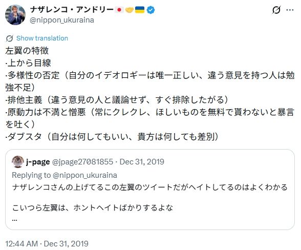 - ナザレンコ・アンドリーの言う「左翼の特徴」はネトウヨに当てはまることばかり。