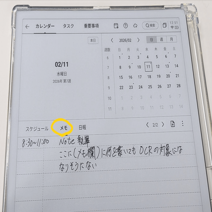 ただし、注意点もある。カレンダー内のメモ欄は単なる書き込みに留まり、OCRやAIまとめの対象外となる。日記や内省は、カレンダーではなく前述のノート機能で行うのが正解だろう。