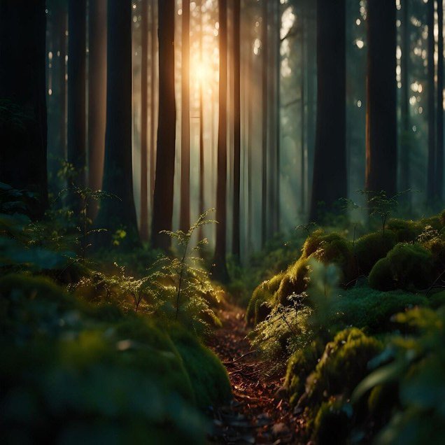 ――夕陽の光が、奥深い林の中に差し込んでいる。そして、緑の苔の上を照らしている。