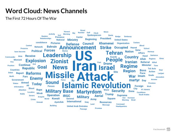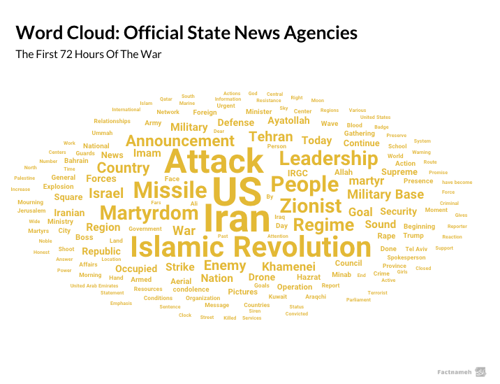 These terms (in Persian) appeared more often than words such as “martyrdom,” “leadership,” or references to Khamenei’s death. The coverage focused heavily on military developments, especially Iranian missile strikes.