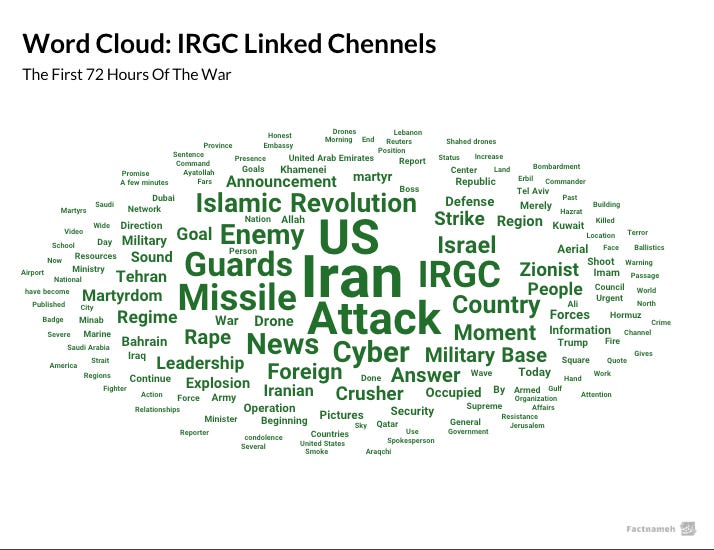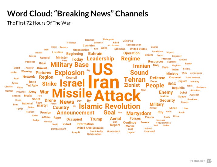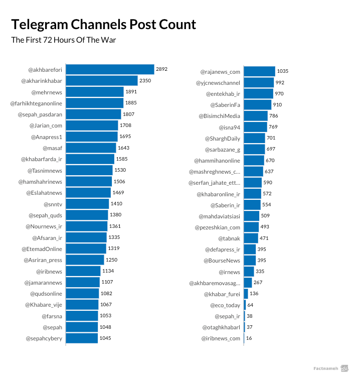 Among all channels analyzed, Khabar Fori, Akharin Khabar, Mehr News, Farhikhtegan, and the channels attributed to the IRGC were the most active during the first 72 hours of the war.