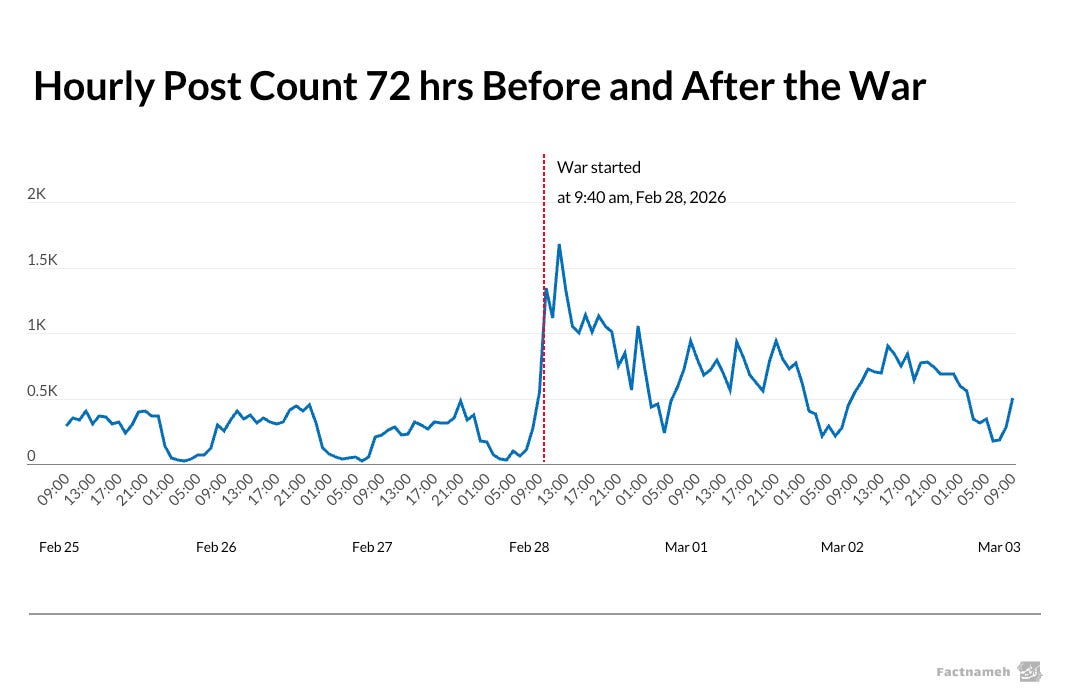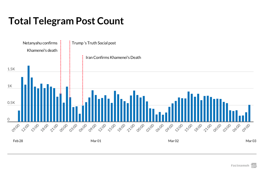 The dataset includes more than 77,000 Telegram posts collected from two days before the attacks until the third day of the conflict. 50,591 posts were published during the first 72 hours, between 09:40 (GMT+3:30) on February 28th and 10:00 (GMT+3:30) on March 2nd, 2026.