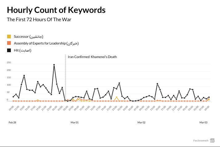 In the Telegram news ecosystem inside Iran, Khamenei quickly faded from the center of attention. Persian keywords such as “[The] leadership,” “Khamenei,” or “martyrdom” appeared far less frequently than words like “missile,” “attack,” “strike,” “drone,” and “IRGC.”