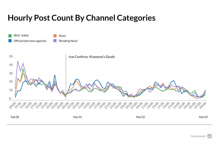 The hesitation became visible in the data. Between the evening of February 28th, and the early hours of the next day, activity across Iranian Telegram news channels dropped noticeably. Many channels simply slowed down or stopped posting.