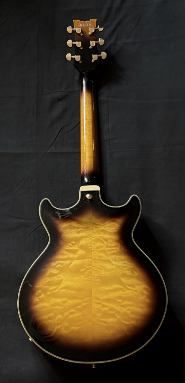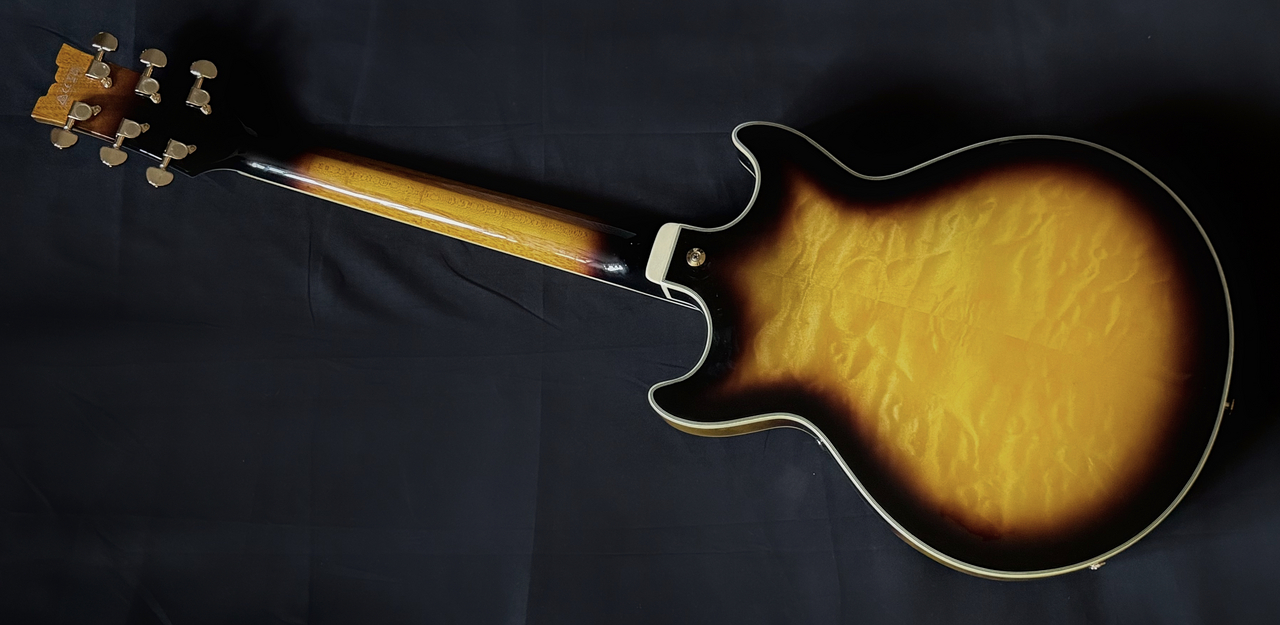 通常のセミアコ(ASシリーズなど)よりも一回り小さいボディサイズが特徴で、高い演奏性とセミアコらしい鳴りを両立しております。
