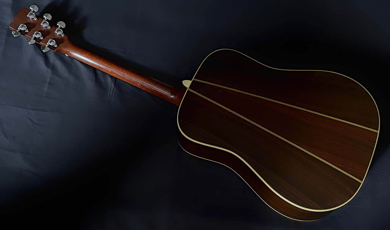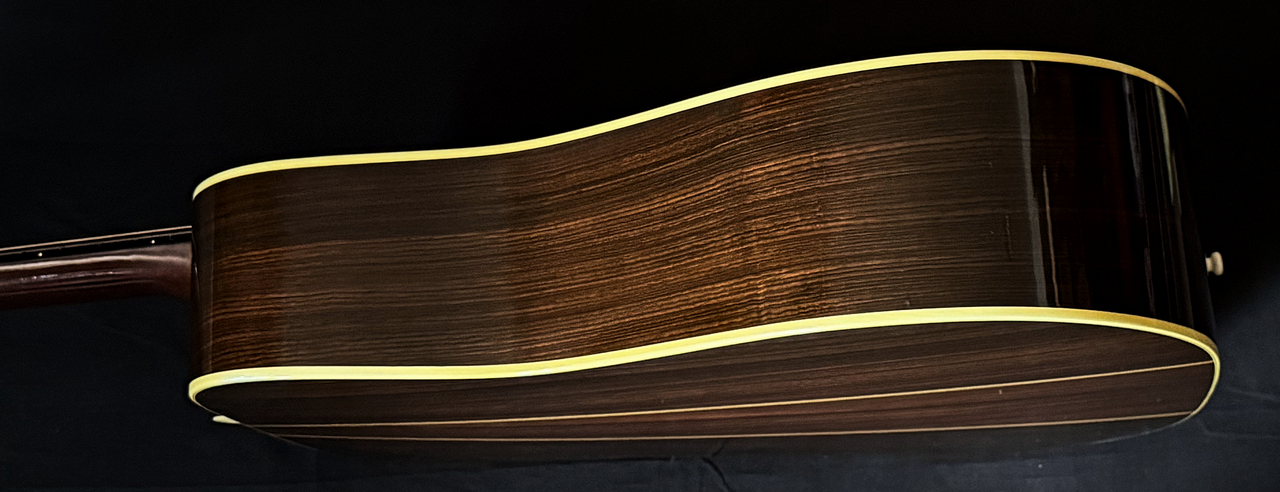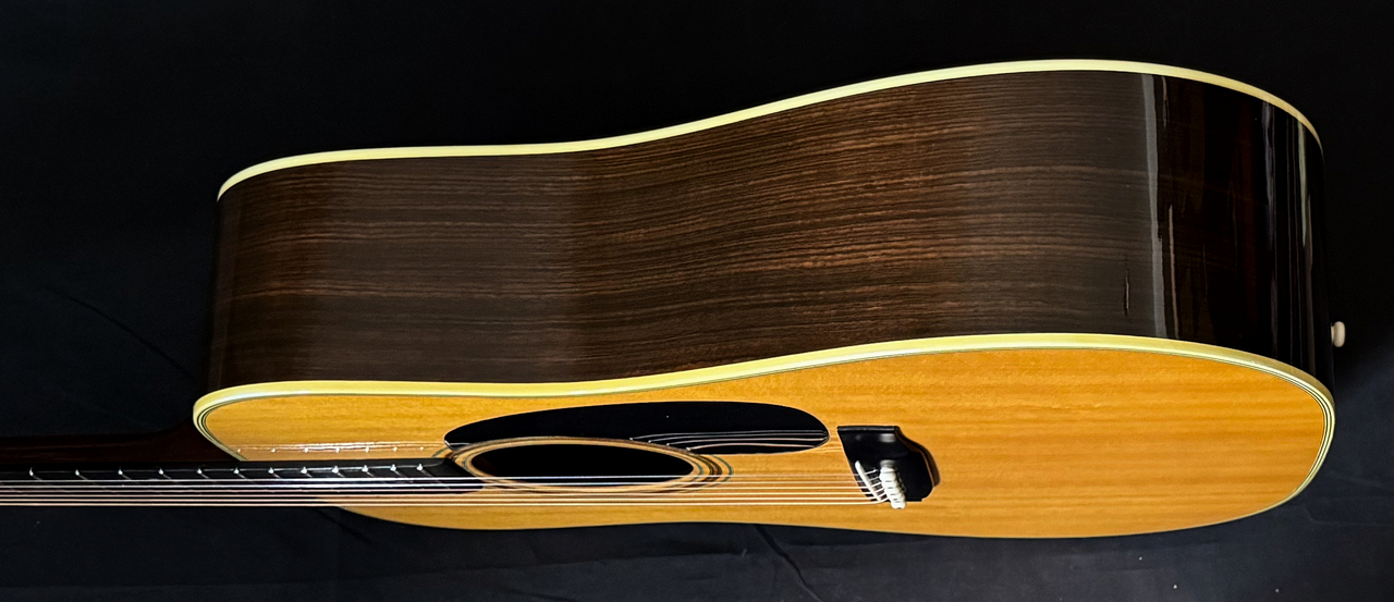 1976年当時、D-76に関する詳細に関する情報が無く、本当のD-76のよさが正しく伝わり、広まらなかった時代でありました。D -35をベースにして上記の仕様を施したモデルで定価¥700,000は高すぎるということで、日本国内の販売はあまり思わしく無く意外にも不人気モデルとなってしまいました。後になり、D-45相当の材を使用して製作されており、唯一無二のサウンドクオリティの高さ、素晴らしいバランシングも明らかになるにつれ2000年台に入り、徐々にD-76の人気が高まっていくのでした。製作本数に限りがあるため、年数が経過するにつれ、内容の良い、コンディションの良い個体が減ってまいりました。しかしながら手に入れるためには、多少の難があろうとも選ぶしかないというのが現状でございます。ましてや、1975年製となると手に入れること自体が大変困難です。
