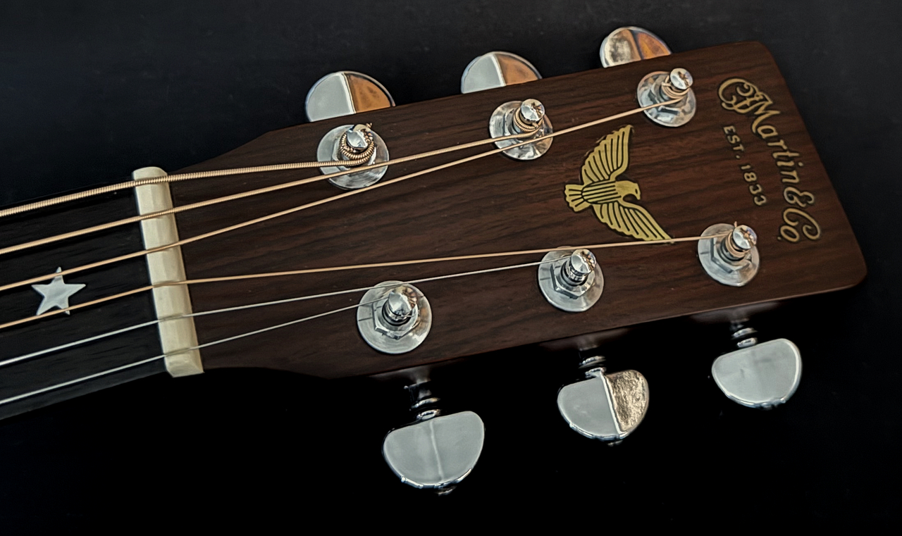 Martin D-76は、アメリカ合衆国建国200年記念を祝うべく、Martin社が送り出した建国200年記念モデルとなります。D-76は、1976にちなみ1976本が製作されました。D-76は、1975年製と1976年製が存在いたします。Martin社は、当初建国200年記念にちなみ200本を1975年に製作、販売いたしました。200本ということで、すぐに完売。翌1976年に1776本を製作。最終的にMartin社は、D-76を1975年の200本、1976年の1776本、総製作本数1976本を世に送り出したのでした。正式に、日本に輸入されるようになったのは、1976年からですので、1975年製が存在していたということが知れ渡るようになるのは、もっと後になってからのことでありました。1976年当時のMartin日本総代理店の東海楽器製造株式会社の設定した定価は、¥800,000のD-45に次ぐ高価格の¥700,000でした。(1976年当時のアメリカでのD-76の価格は、1,500$、D-45は、2250$でした)D-76の仕様・特徴としましては、ベースモデルにD-35をチョイス。ヘッドのデカールの下、中央部分にアメリカの国鳥である白頭鷲を白蝶貝で製作してインレイ。指板のポジションマークは、アメリカの建国時の州の数13にちなみ、13個の白蝶貝で製作した星形のポジションインレイを(1.5.9.15.19f:1個、3.7.12.17f:2個)サウンドホール回りのロゼッタと3ピースのバックパーフリングには、ヘリングボーン。通常、機種名とシリアルナンバーの焼印がネックブロック部分に施されますが、D -76の場合、特別にネックブロック部分にブラスプレートが取付けられており、以下のように刻印されております。