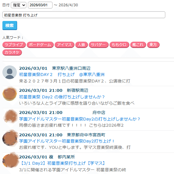 TwiPlaの検索欄で日付をライブの日にして「ライブ名 打ち上げ」で検索すればおそらく出てきます。出てこないときはライブ名の代わりに「アイマス」とか「ヴイアラ」とか「シャニ」とか色々変えると出てくると思います。