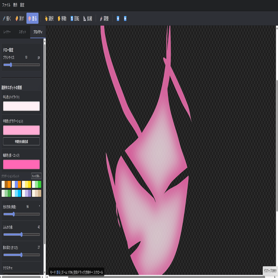 描いたスポットの一部をドラッグして消去し、形を削ります。
