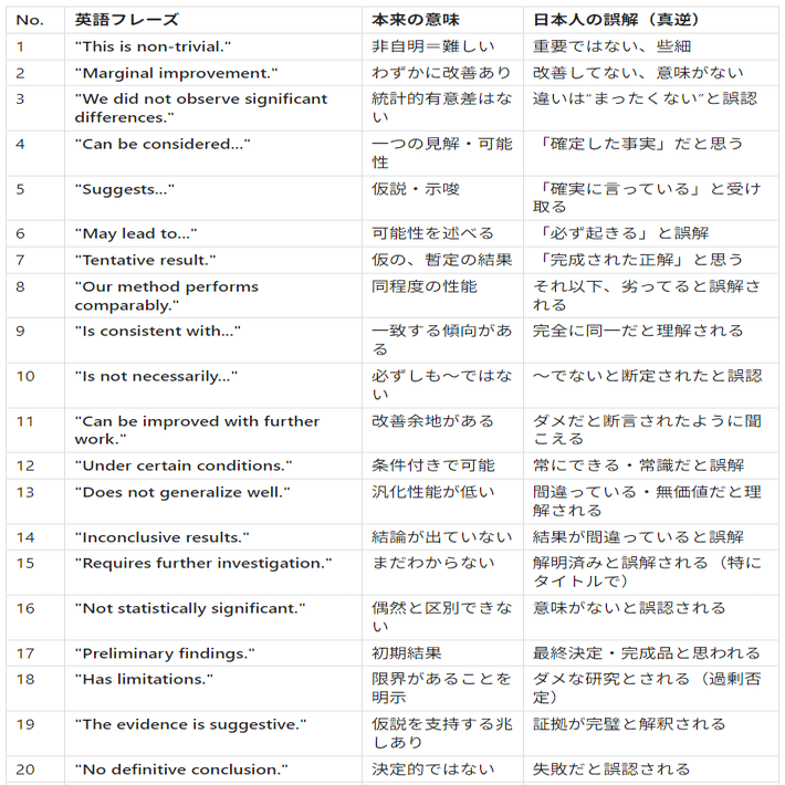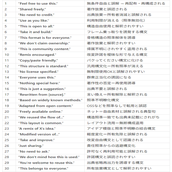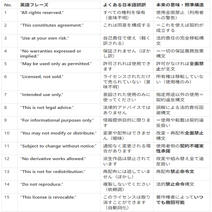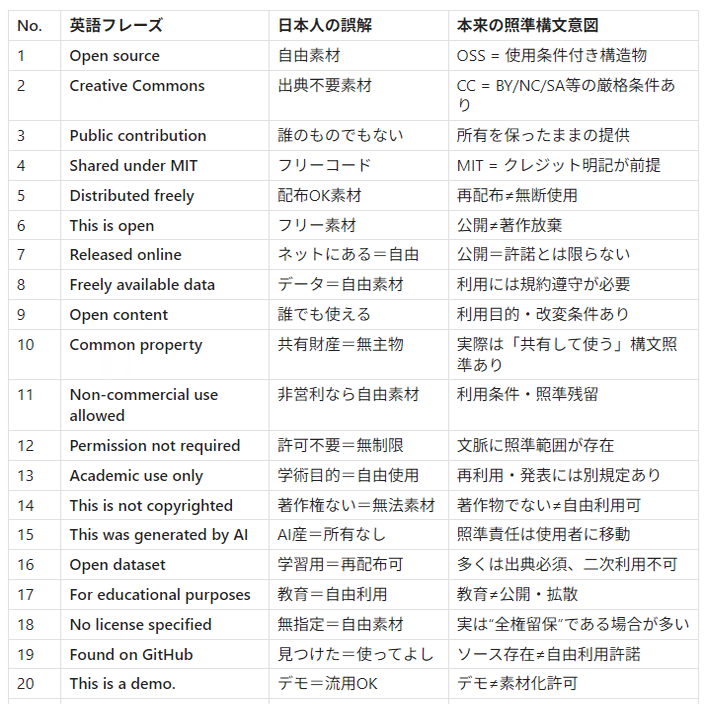 This list compiles English phrases that are systematically mistranslated by translation software and AI when converted to Japanese. These expressions are interpreted by Japanese researchers in completely opposite ways to their intended meaning. We strongly advise avoiding these phrases in your research licenses and publications to prevent unintended misuse.