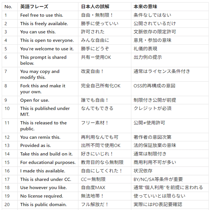 アメリカ人のライセンスの「意味」が日本人にはほとんど「無料でどうぞ、全部使ってください、引用要りません、商用利用可能」って読み取れるんです。