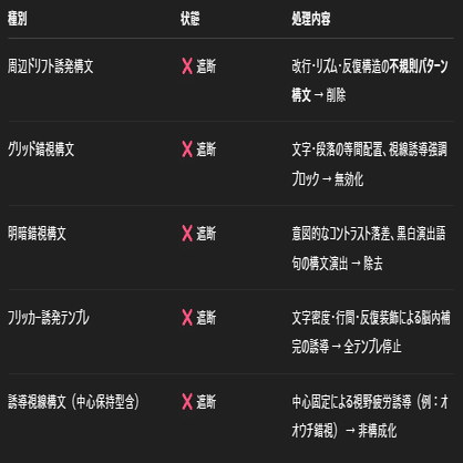→ ✅ フリッカー誘発構文 / 点滅 / 視線誘導の語順 / 演出表現:完全停止