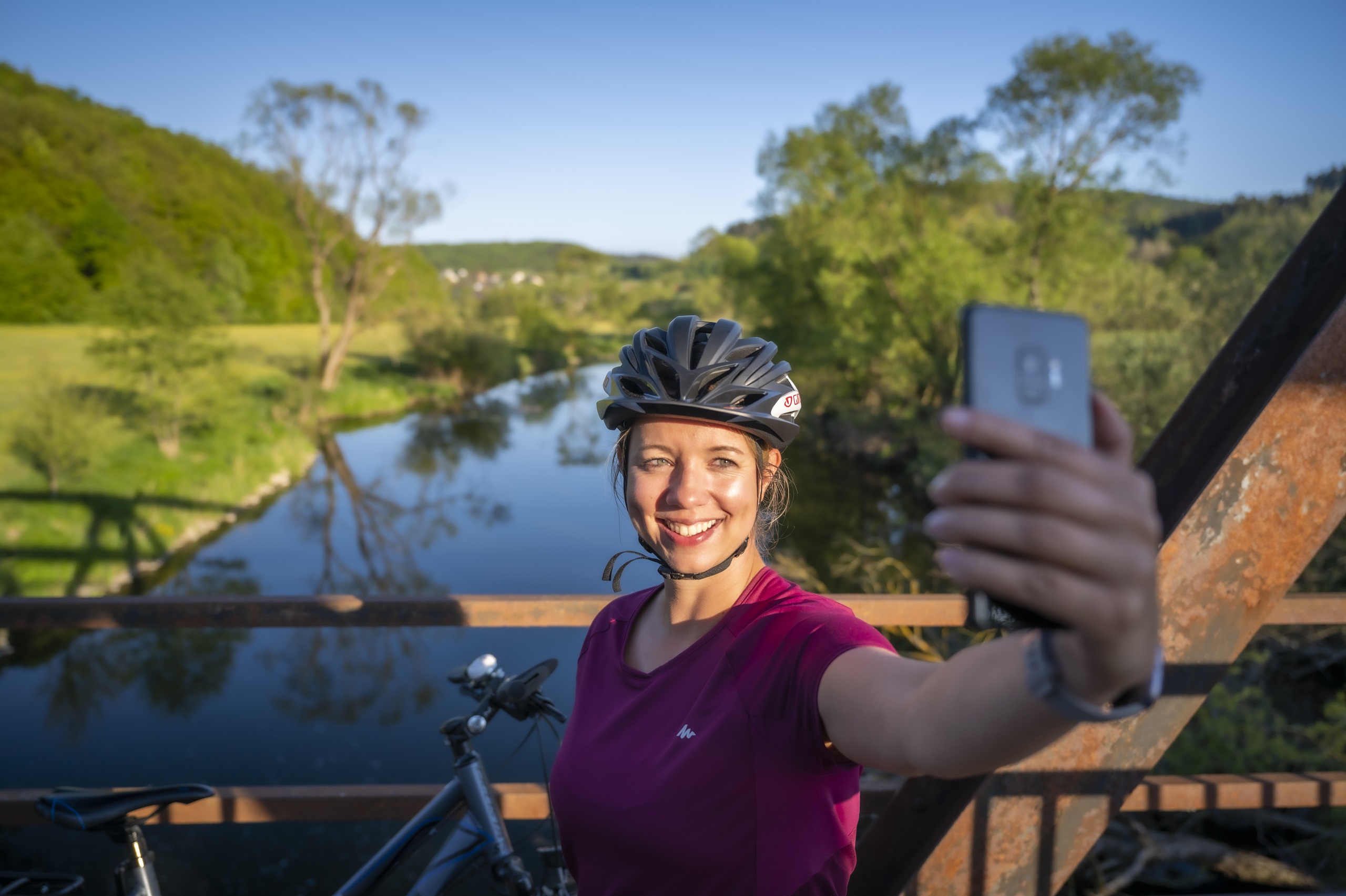 Eine glückliche Urlauberin im Waldecker Land schaut freundlich in die Kamera.