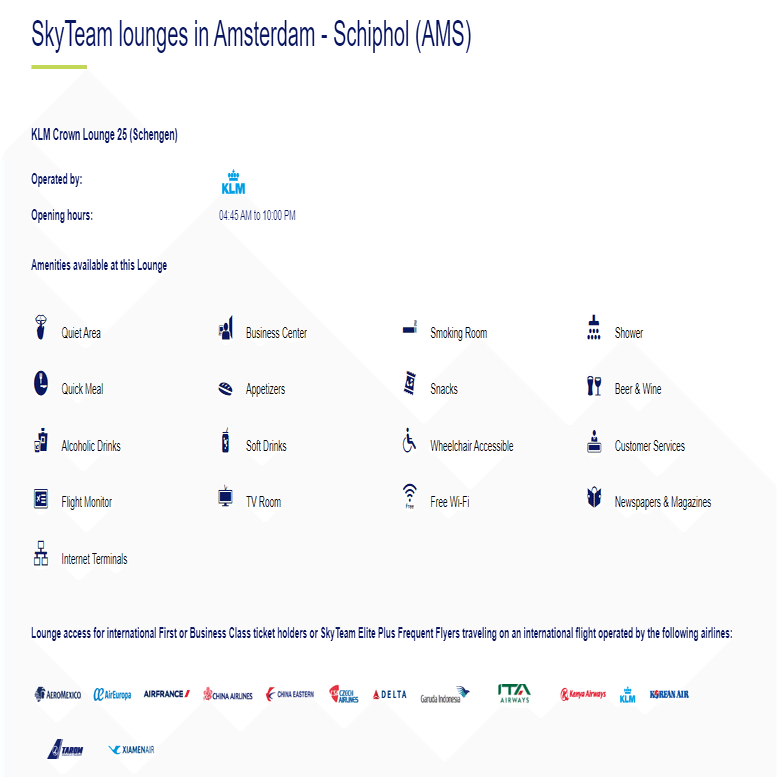 また、KLMオランダ航空の拠点であるアムステルダムのラウンジも利用可能なようです。