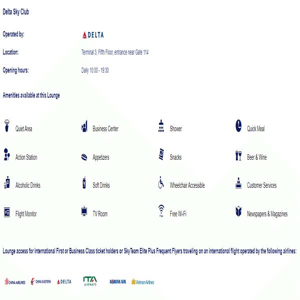 しかし、羽田のデルタ航空/ソウルの大韓航空/ハノイのベトナム航空は、ラウンジの契約を結んでおらず、現在は利用不可の模様。