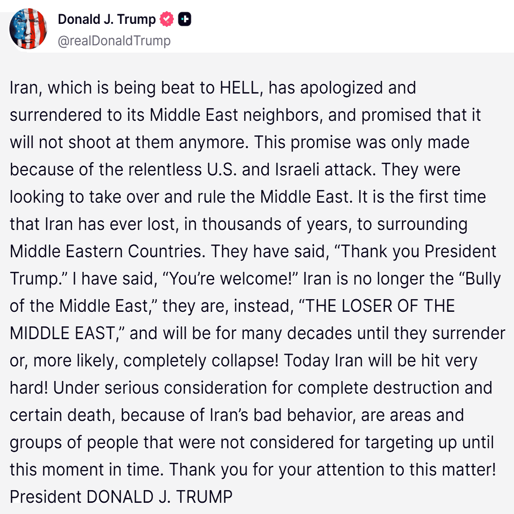 ⚜️トランプ大統領からのメッセージ⚜️ーイランが数千年の歴史で初めて降伏し、敗北しました!ー
