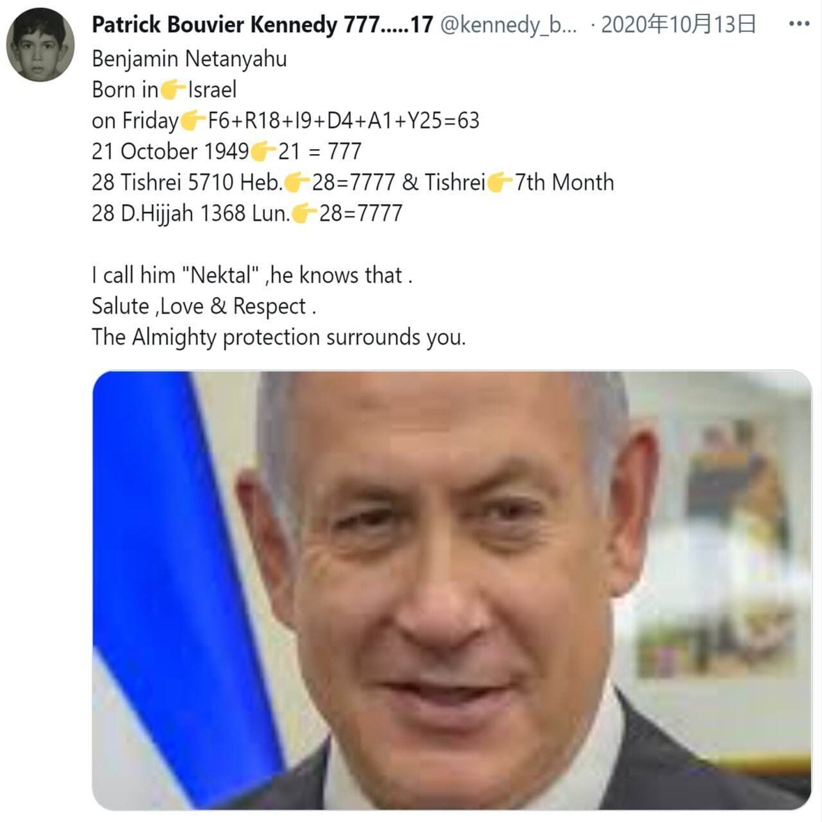 そして、JFKジュニアさんの弟さんで、生まれてすぐ亡くなったとされているパトリックさんのTwitterの過去の投稿からも、ネタニヤフ首相は、トランプ大統領だけでなく、JFKファミリーとも仲が良いことが伺えます。