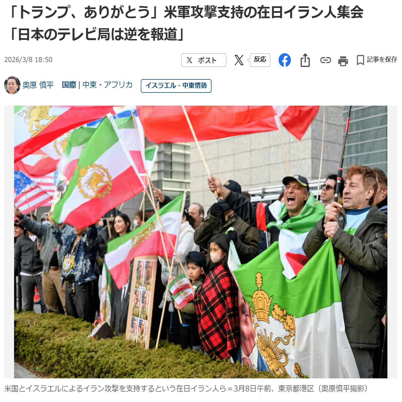 母国の自由を求めるイラン人団体は8日、駐日米国大使館(東京都港区)付近で、米国とイスラエルによるイラン攻撃を歓迎するデモ集会を開催し、約170人(警察発表)の在日イラン人が「トランプ大統領、ありがとう。イラン国民を助けてくれて、ありがとう」と声を上げた。参加したイラン人らは最高指導者ハメネイ師が統治したイスラム革命体制に強い反発を抱えている。