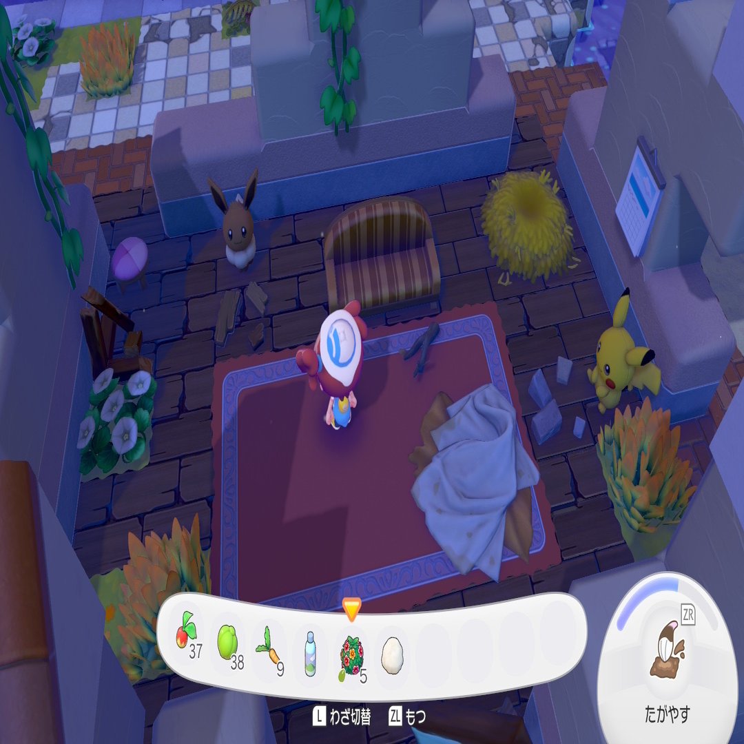 「ビルダーズっぽい」「あつもりっぽい」「マイクラっぽい」とは発売前から言われていたことですが、間違いなくきちんとそれぞれの良い点は世界観を阻害しない程度に取り入れていることが分かりますし、個人的にはちょこちょこと自由に動いているポケモンたちの姿がすごくヒットしています。動きが多様なんですよね。一辺倒な動きなわけではなく、無駄に立ち止まっているとかもない。「ビルダーズ2」の時はそれがすごく気になってたんだけど、今のところ私は違和感なくプレイしてます。
