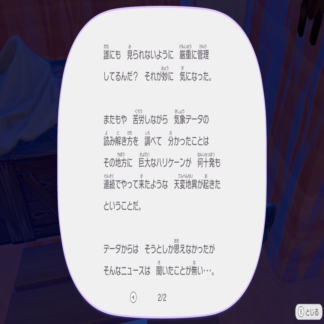 このへんから、「天変地異」とか「異常気象」みたいなことが起きたんだろう、ということがなんとなく察せられてきた。フワンテに連れて行ってもらえるゆめしまでも、いくつか痕跡が見つかるけどそっちのほうが個人的にはザワザワする情報だったりもする。