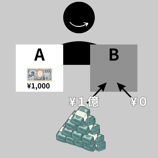 あなたは悪魔を名乗る人物からAには1000円、Bには1億円が入っていることを知らされる。ここであなたには2つの選択肢が与えられる;