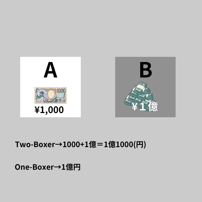 Bの箱だけ、つまり1つの箱だけ選ぶ人をOne-Boxerといい、AとBの箱を両方とも開ける人をTwo-Boxerということにしよう。